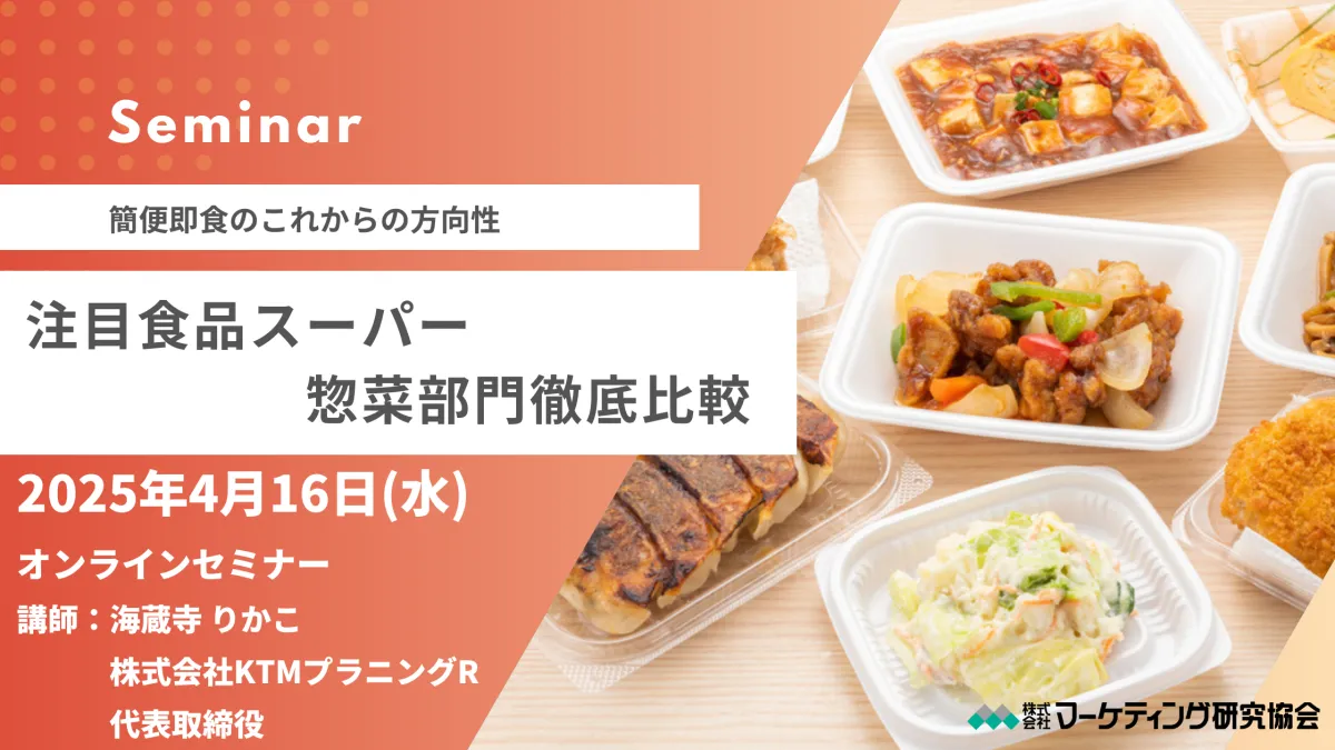 2025年4月16日(水)、株式会社マーケティング研究協会は、惣菜部門に特化した徹底分析セミナーを開催します。このセミナーでは、惣菜部門のトレンドや戦略を詳しく解説し、参加者が今後の業界方向性を見極めるための重要なインサイトを提供します。