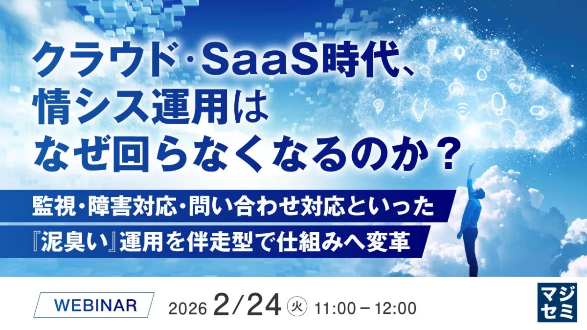 このような状況を打破するべく、ウェビナーが開催されます。テーマは「クラウド・SaaS時代の情シス運用が回らなくなる理由」と、その解決策です。運用業務をどのようにして切り出していくか、特に24時間・365日対応が求められる泥臭い運用を効率的に行う方法論を探ります。