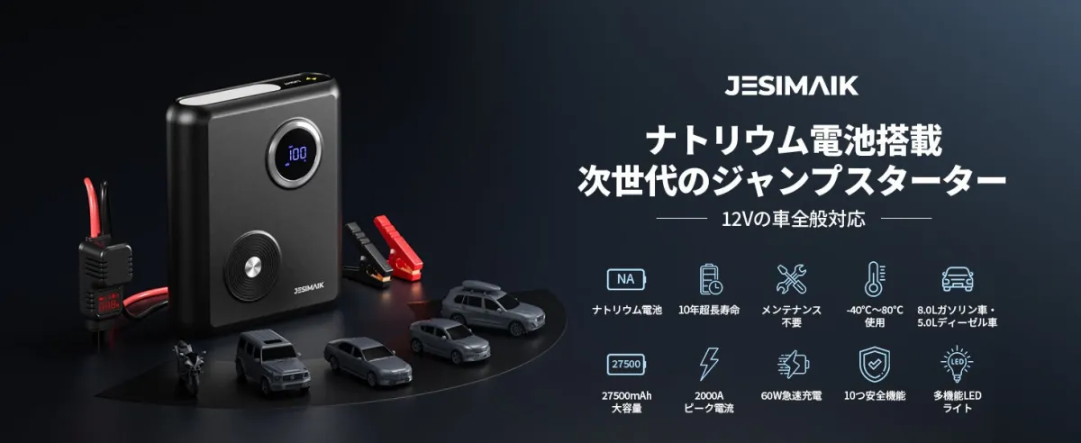 JESIMAIKジャンプスターターGK03は、ナトリウム電池を搭載したことで安全性、使いやすさ、充電速度などが飛躍的に向上しました。特にバッテリーのトラブルに対処するアイテムを探している方にとって、この新しいジャンプスターターは非常に頼りになる存在となるでしょう。