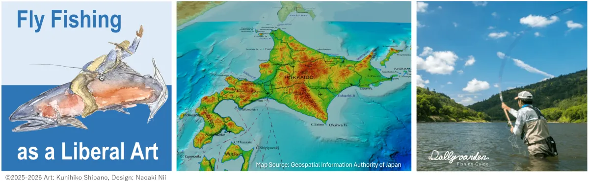 - - 体験学習: プロガイドが北海道の魅力を語り、実際にフライを巻いたりキャストしたりする実習が行われます。