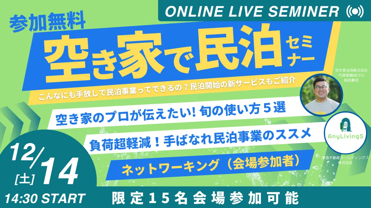 2024年12月13日と14日の2日間にわたり、オンラインとオフラインで「空き家で民泊セミナー」が開催されます。このセミナーでは、空き家の新たな活用方法として民泊にスポットを当て、初期費用をゼロに抑える方法や手軽に運営できる仕組みを紹介します。