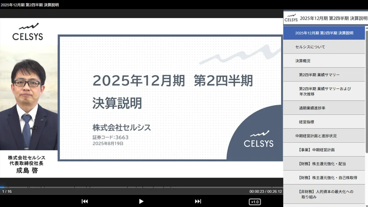 2023年8月19日、デジタルコンテンツ制作のリーディングカンパニー、セルシスが「2025年12月期第2四半期決算説明動画」を公開しました。この動画は、8月8日に発表された決算短信や補足資料を基に制作されており、約26分の内容で、代表取締役が自ら経営の現状を詳しく説明しています。