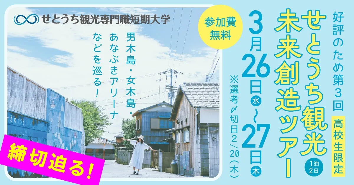 最初のプログラムは、令和6年3月に香川県三豊市で行われ、父母が浜や粟島を訪れることが予定されています。参加者は、せとうち観光専門職短期大学の学生と共に、地域の観光資源に触れ、ワークショップ形式で意見を交換する機会もあります。