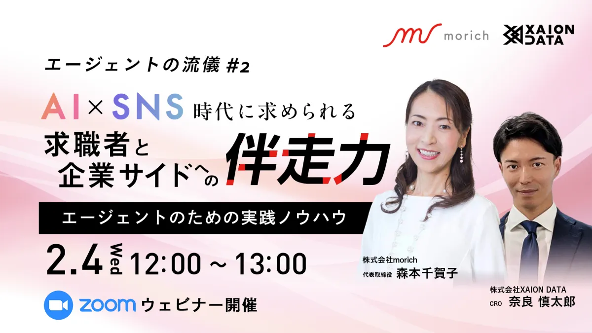 転職市場が変動し続ける現代、エージェントの役割も進化しています。株式会社XAION DATAが提供する転職潜在層へのアプローチSaaS『AUTOHUNT』は、株式会社morichとの共催で「エージェントの流儀 #2─AI×SNS時代に求められる求職者と企業サイドへの伴走力」というオンラインセミナーを開催します。このセミナーでは、AIとSNSを駆使して求職者理解を深め、企業との連携を強化し、「成果につながる伴走力」をどう向上させるかに焦点を当てます。