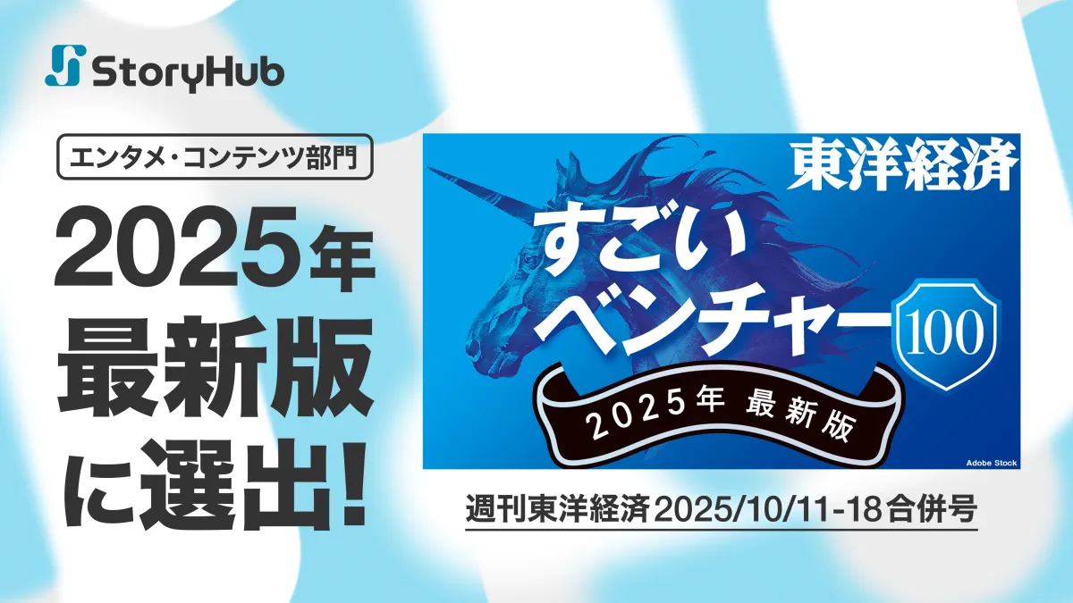 StoryHub株式会社(本社:東京都千代田区、代表取締役CEO:田島 将太)は、週刊東洋経済が選定する『すごいベンチャー100』の2025年版において、エンタメ・コンテンツ部門の一社として名を連ねました。この選出は「エンタメ・コンテンツ」カテゴリーにおける5社の中の1社としての評価を受けた結果です。