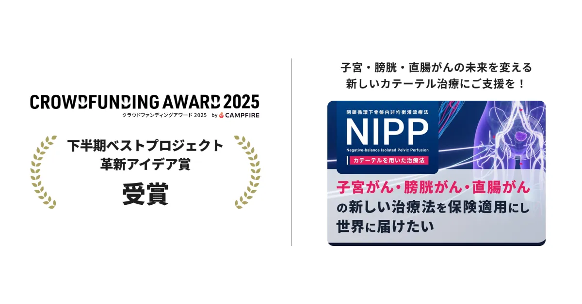 今回の受賞は、クラウドファンディングプロジェクト「子宮・膀胱・直腸がんの未来を変える新しいカテーテル治療にご支援を!」によるものです。このプロジェクトは、2025年5月14日から8月1日まで期間中、合計1,129件の支援を受け、14,635,500円という大きな資金を集めました。このプロジェクトの目的はNIPP(閉鎖循環下骨盤内非均衡灌流療法)専用の医療器具の開発であり、その成果をもって健康保険下で誰もが治療を受けられる社会の実現を目指しています。毎年多くの人々が子宮がん、膀胱がん、直腸がんに罹患し、治療が必要とされています。