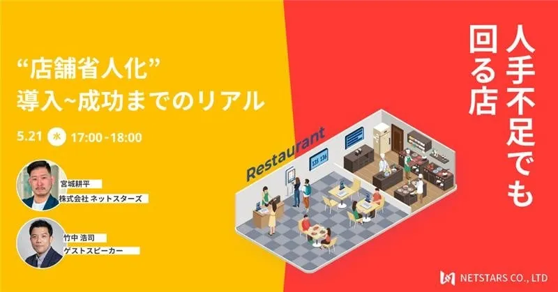 株式会社ネットスターズは、2025年5月21日(水)17時から「店舗省人化導入~成功までのリアル」というウェビナーを開催します。このウェビナーでは、店舗の省人化サービスの導入現状や実際の効果について、具体的な事例を交えながら紹介します。