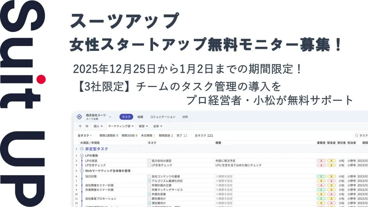 2025年12月25日から2026年1月2日までに「スーツアップ」の無料トライアルに申し込んだ女性スタートアップの中から、3社限定で無料モニターが選ばれます。 モニターとなった企業には、操作性や機能の改善点についてフィードバックを求められ、一定の期間、特別にサービスを無償で利用する特典があります。