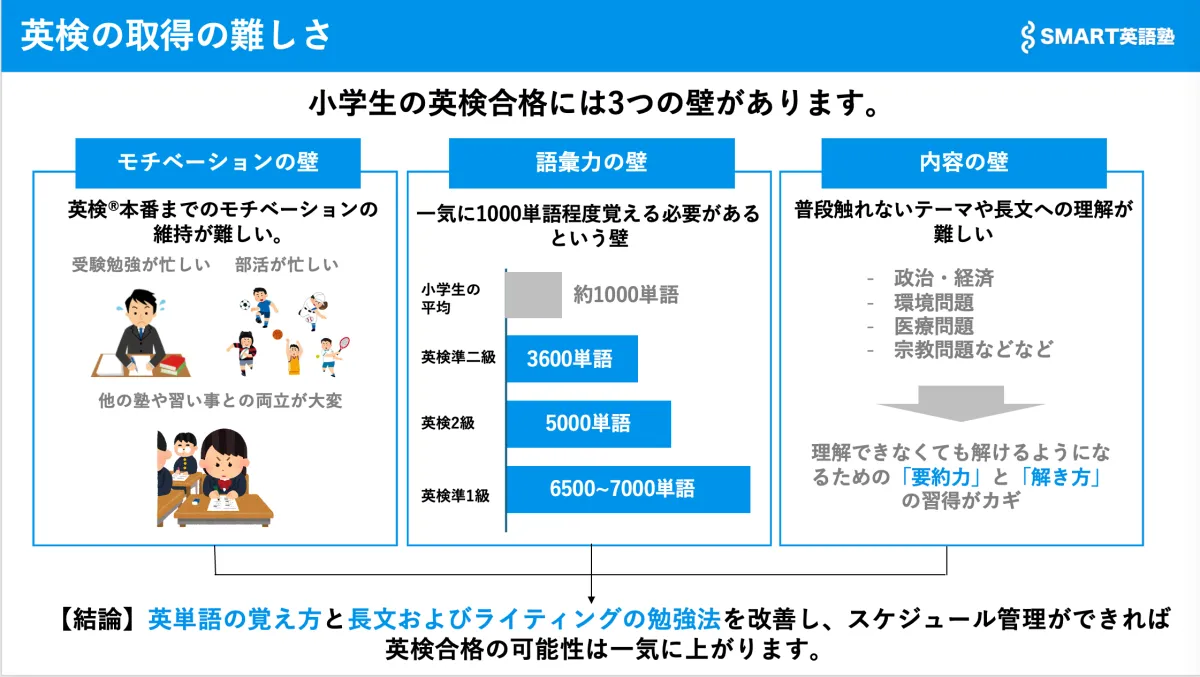 SMART英語塾では、小学生が英検合格を目指す際に直面する主な課題について以下の3つの壁を挙げています。