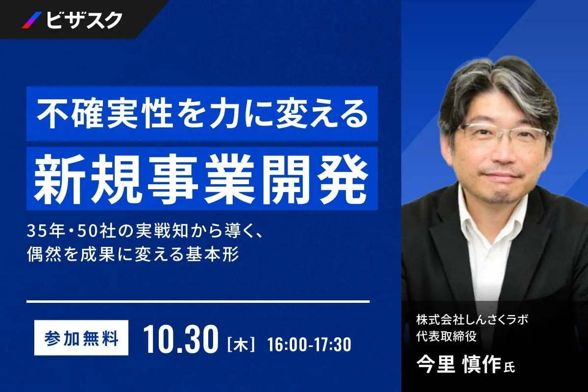2023年10月30日(木)16:00、株式会社ビザスクが主催する無料オンラインセミナーが開催されます。テーマは『不確実性を力に変える新規事業開発』。このセミナーでは、株式会社しんさくラボの代表取締役今里慎作氏が登壇し、不確実性の中で新しい価値の創造をするための基本形を考察します。