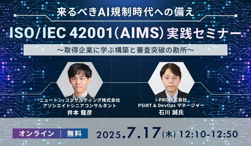 2023年7月17日(木)12:10から12:50まで、オンライン(Zoom)で行われるこのウェビナーでは、AIMS構築に関する具体的なステップや、認証取得に向けた準備について詳しく解説します。特別ゲストとして、i-PRO株式会社の石川氏を迎え、実際のプロジェクトでの経験や、審査のポイントなど、実務に役立つ情報を提供します。