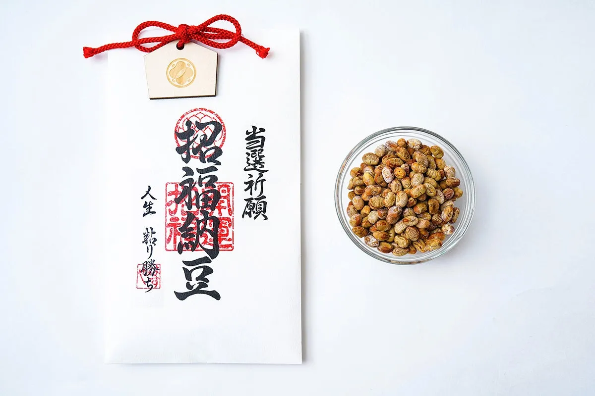 『はすや完走納豆』のパッケージは、まるでお寺の御朱印を模したかのようなユニークなデザイン。大きく描かれた「招福納豆」の文字は、納豆の「粘り」に由来し、福を引き寄せるイメージを表現しています。これに加え「人生 粘り勝ち」というメッセージも施されており、応援の気持ちが込められています。
