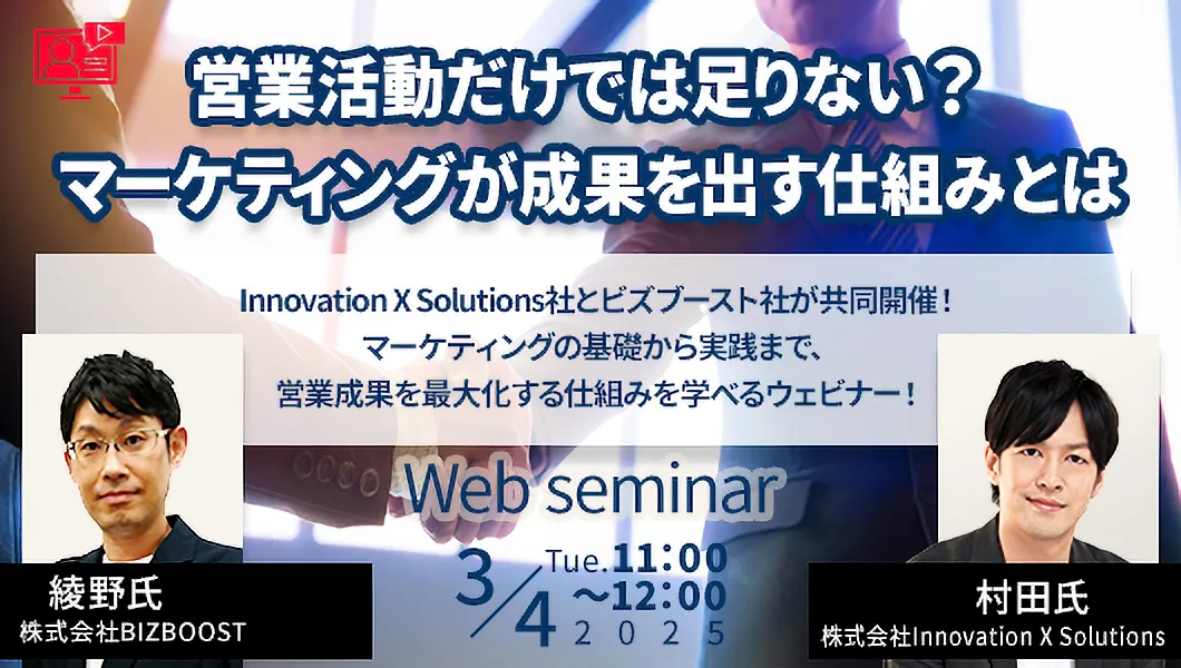 マーケティングの専門知識が求められる現代、営業活動だけでは十分な成果を上げることは難しくなっています。そんな中、株式会社Innovation X Solutionsが、2025年3月4日(火)に特別ウェビナー「営業活動だけでは足りない?マーケティングが成果を出す仕組みとは」を開催します。本セミナーは、ビズブースト株式会社との共催で、BtoB企業のマーケティングと営業企画に携わる皆様にとって非常に有益な内容となっています。