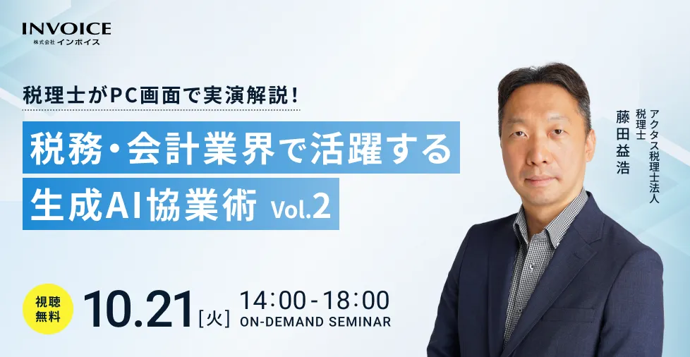 2025年10月21日(火)、株式会社インボイスが主催する「税理士が税務・会計業界で活躍する生成AI協業術vol.2」のオンラインセミナーが開催されます。このセミナーでは、アクタス税理士法人の藤田益浩氏が招かれ、生成AIの実践的な活用法について解説します。