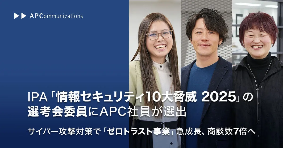 株式会社エーピーコミュニケーションズ(以下「当社」)は、当社のiTOC事業部 BzD部 0-WANから山根康裕、田中潤子、小澤志織の3名が、IPA(独立行政法人情報処理推進機構)の「情報セキュリティ10大脅威 2025」選考会委員に選ばれたことをお知らせします。これにより、当社は3年連続で同委員にメンバーを輩出することになりました。