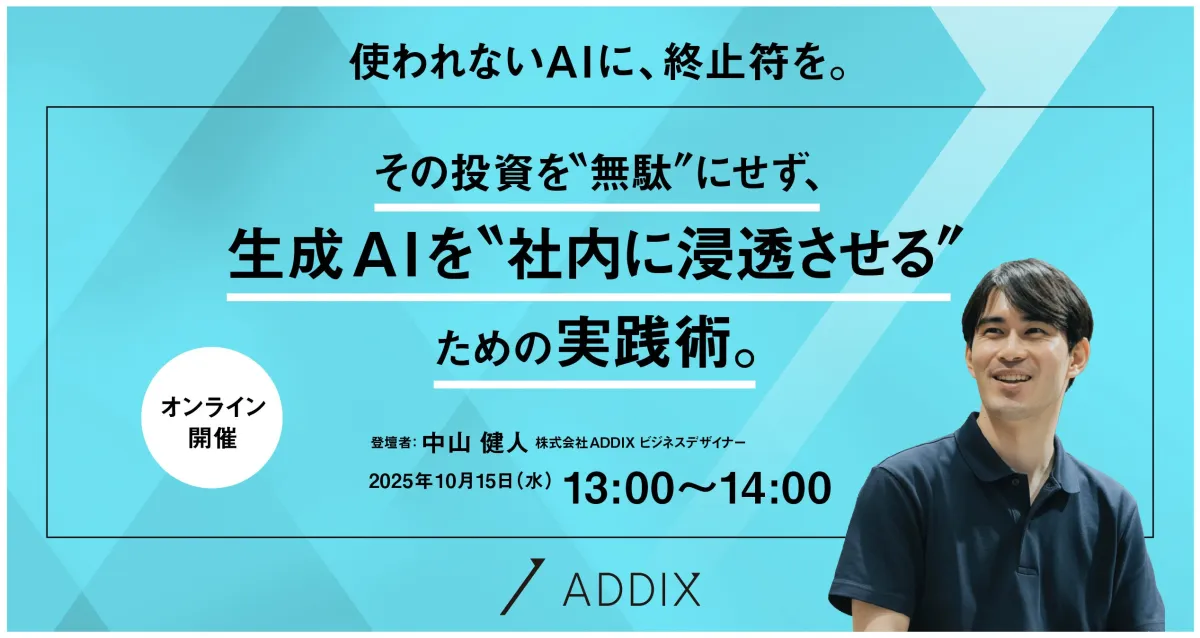 株式会社ADDIXは、2025年10月15日(水)にオンラインで生成AIに関するセミナー「使われないAIに、終止符を。」を開催します。このセミナーは、生成AIを導入したものの、その活用が思うように進まない企業を対象とし、AIの価値を最大限に引き出す方法を具体的に解説します。