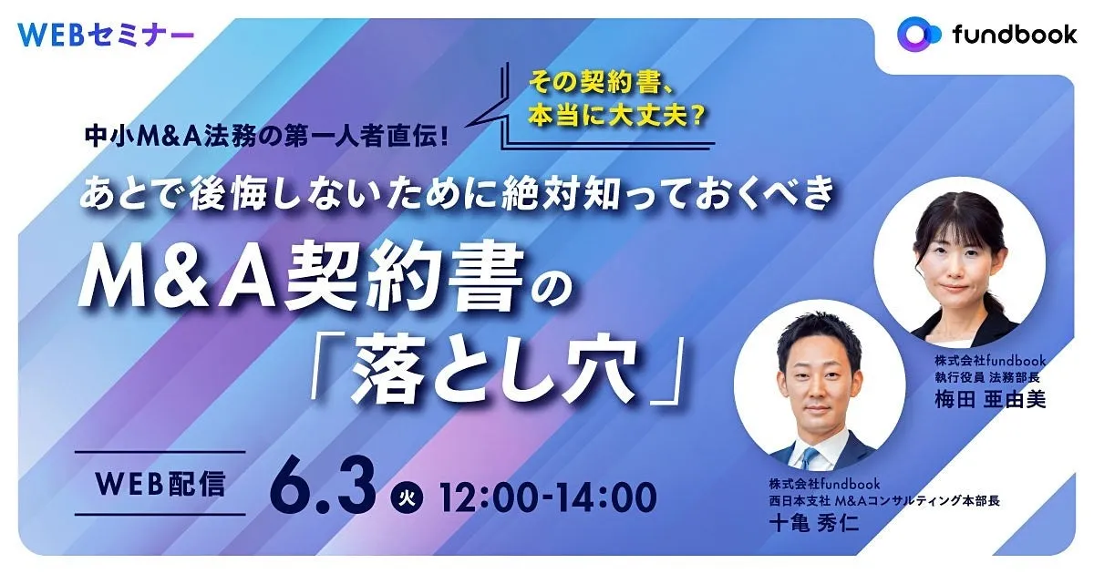 2025年6月3日(火曜日)、株式会社fundbookが開催するオンラインセミナーにご注目ください。本セミナーのテーマは「その契約書、本当に大丈夫?」。M&A仲介を手がける㈱fundbookの主催となっており、中小企業の経営者の皆さまには必見の内容です。