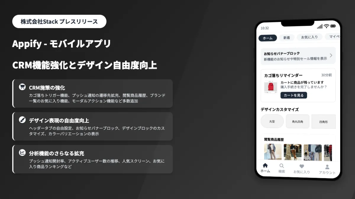 株式会社Stackは、Shopifyストア向けのモバイルアプリ構築サービス「Appify - モバイルアプリ」に新機能を多数追加し、機能強化を実施することを発表しました。これにより、顧客体験の向上に加え、デザインの自由度も大幅に拡充され、全ての機能が追加費用なしで使用可能です。
