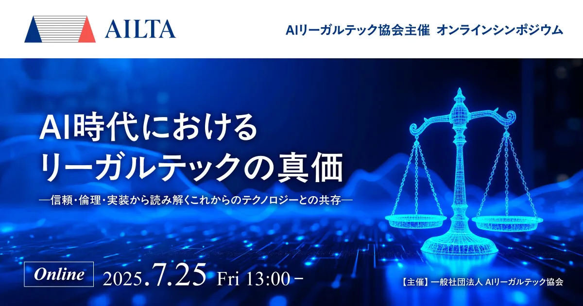 2025年7月25日(金)13時より、一般社団法人AIリーガルテック協会が主催するオンラインシンポジウム「AI時代におけるリーガルテックの真価」が開催されます。本シンポジウムは、今後の法律業界におけるAIとリーガルテックの影響を、信頼性、倫理性、実装という3つの視点から多角的に考察するイベントです。