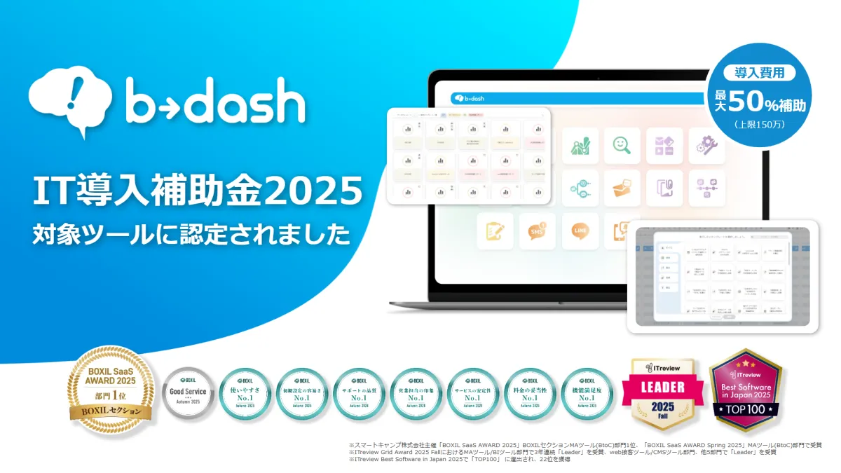株式会社データXが提供するデータマーケティングプラットフォーム「b→dash」が、IT導入補助金2025の対象ツールに認定されました。この認定により、評価の高い「b→dash」の魅力がさらに広がることでしょう。特に中小企業や小規模事業者にとって、この補助金は業務効率化やデジタルトランスフォーメーション(DX)の推進を支援する大きな機会です。