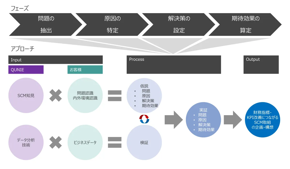 このサービスの中心は、クニエの専門コンサルタントが持つ豊富な知識と高度なデータ分析能力です。具体的には、SCM担当者へのインタビューやビジネスデータの分析を通して、サプライチェーンにおける問題やその根底にある原因を特定し、効果的な解決策を策定します。さらに、このプロセスにより企業は期待される財務的な効果を予測し、実行可能なSCM戦略を実現することができるのです。