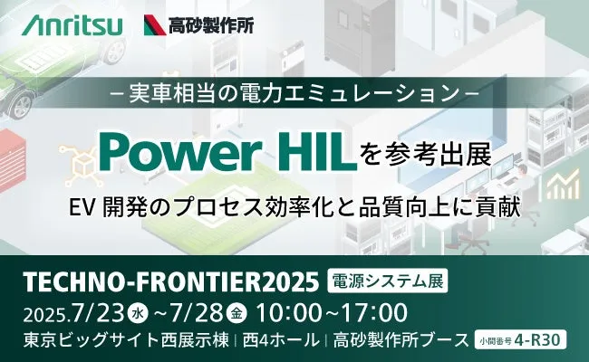 アンリツ株式会社(社長 濱田 宏一)は、2025年7月23日から25日まで東京ビッグサイトで開催される『テクノフロンティア2025電源システム展』に出展します。本出展では、グループ企業である高砂製作所のブース内で、電力エミュレーションシステム「Power HIL(パワーヒル)」を参考展示します。