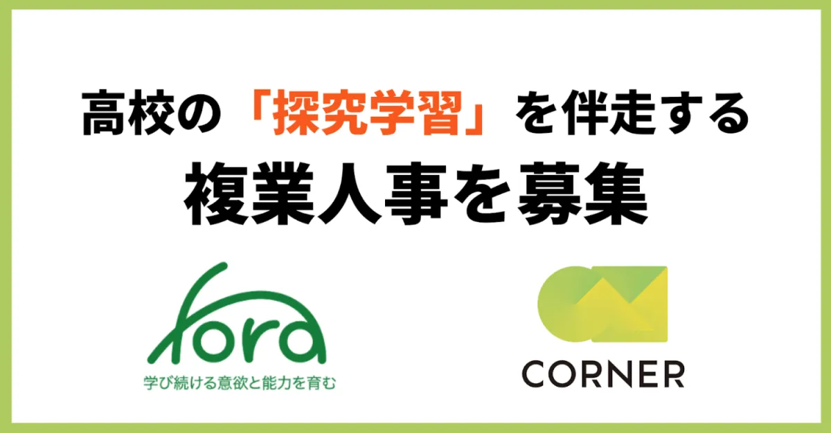 2022年度から必修化された「探究学習」。教員の限られた時間やスキルが影響し、外部サービスの導入が進んでいます。このような環境の中で、Foraは「主体性・知的好奇心を引き出す指導スキルの向上」が課題となっています。これを受けて、Foraと株式会社コーナーが連携し、生徒の学びをより深めるための支援をする人材を求めています。例えば、キャリア面談やコーチングによって教員の力量を引き出すことが期待されています。