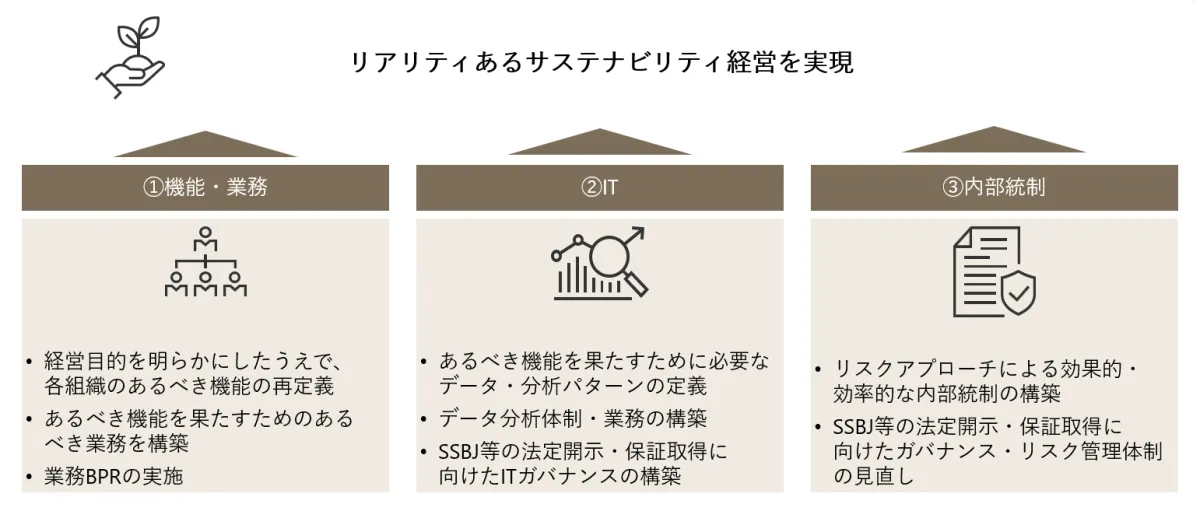 サステナビリティ経営を実効性のあるものとするためには、マテリアリティの特定、リスクや機会の財務影響の評価、KPIの設計が不可欠です。加えて、各業務の見直しやデジタル技術の活用が求められ、そのためには内部統制が適切に機能する仕組みを整える必要があります。このような課題を解決するため、両社は3つの主要な支援サービスを提供します。