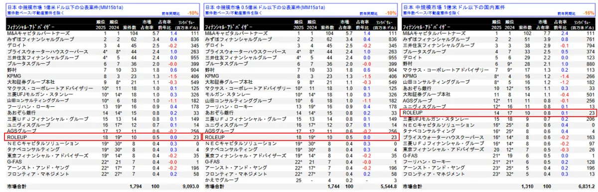 株式会社ROLEUPが、LSEG(ロンドン証券取引所グループ、旧リフィニティブ)による2025年上半期の中規模市場M&Aリーグテーブルにおいて、注目すべき成績を収めました。このリーグテーブルは、1億米ドル以下の公表案件を対象としており、ROLEUPはその中で18位にランクイン。また、0.5億米ドル以下の案件でも18位、国内の1億米ドル以下の案件においては14位に位置付けられました。