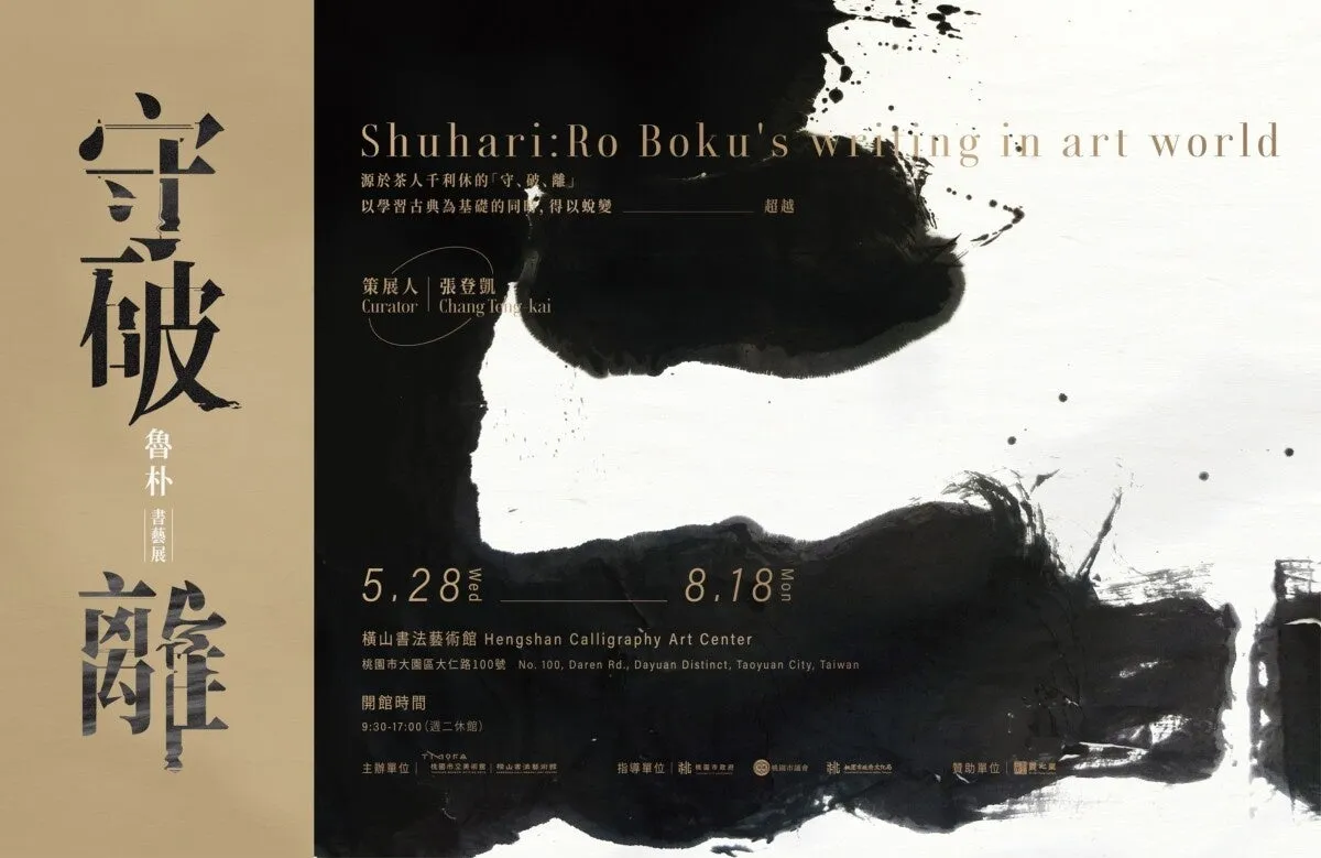 本展のテーマは「守・破・離」です。この考え方は、日本の茶道思想から来ており、「守」は伝統に従うこと、「破」は伝統を革新すること、そして「離」は型から自由になることを指します。魯朴氏の書道展では、これらのステージを通じて、技術のみならず作家の思想や心情の進化も表現されています。