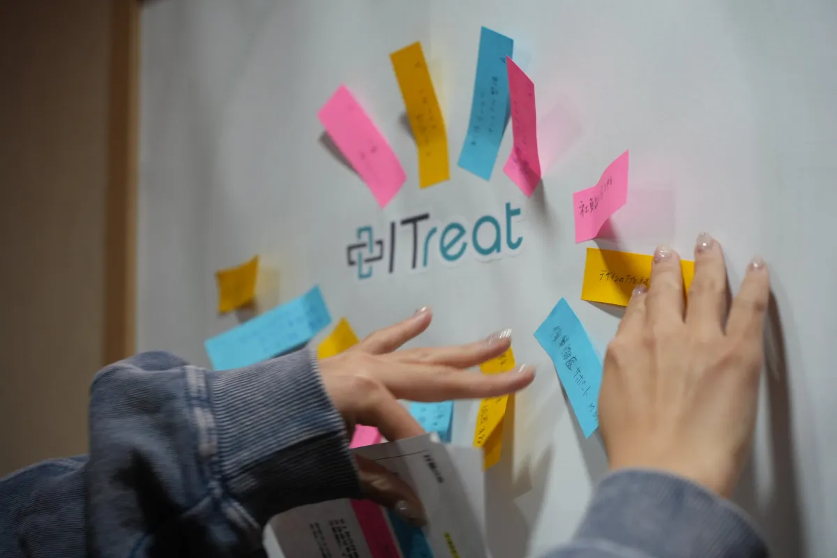 イベントのメインテーマとなったのは「ビジョンマップ」です。この取り組みでは、ITreatのロゴを中心に、それを囲む形で社員が付箋を貼りつけ、それぞれの想いを書き出していきました。付箋は3色に分けられ、各テーマに沿った視点から未来を描いています。