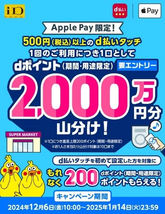株式会社NTTドコモが、2024年12月6日から2025年1月14日までの期間、Apple Payを利用した「d払いタッチ」キャンペーンを実施します。このキャンペーンの名は「Apple Pay d払いタッチ2,000万ポイント山分けキャンペーン」。