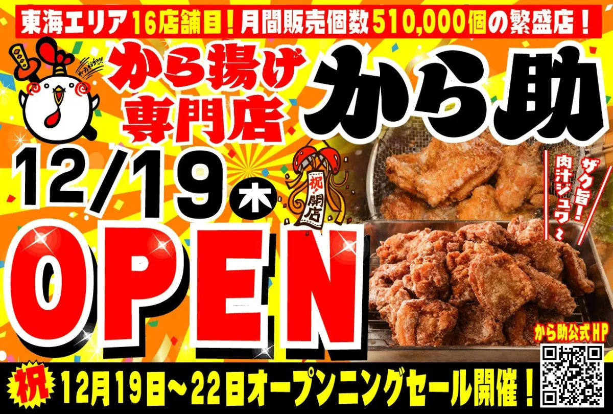 2024年12月19日(木)、愛知県日進市の商業施設『プライムツリー赤池』にから揚げ専門店『から助』の16号店がオープンします。この注目のお店は、ザクッとした食感とジューシーな味わいの揚げたてジャンボ唐揚げを自慢にしています。