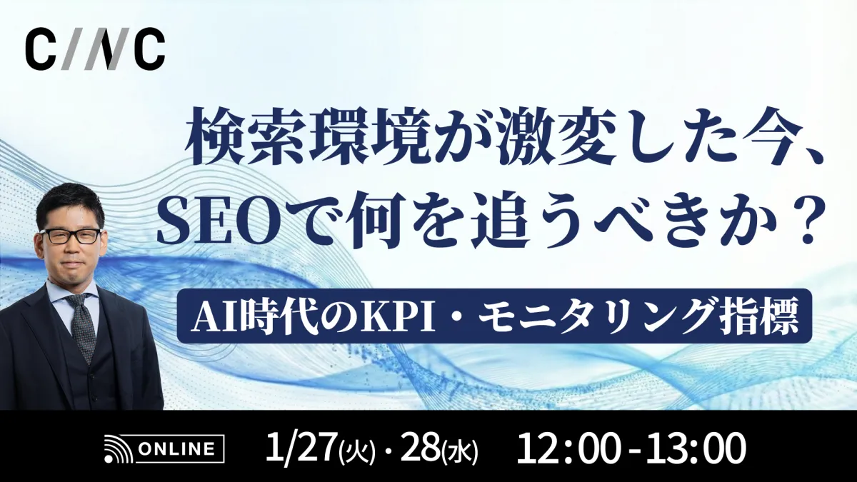 2026年の1月27日と28日、株式会社CINCが主催するオンラインセミナーが行われます。このセミナーは「検索環境が激変した今、SEOで何を追うべきか?AI時代のKPI・モニタリング指標」というテーマの下、参加者に向けて重要な情報を提供します。