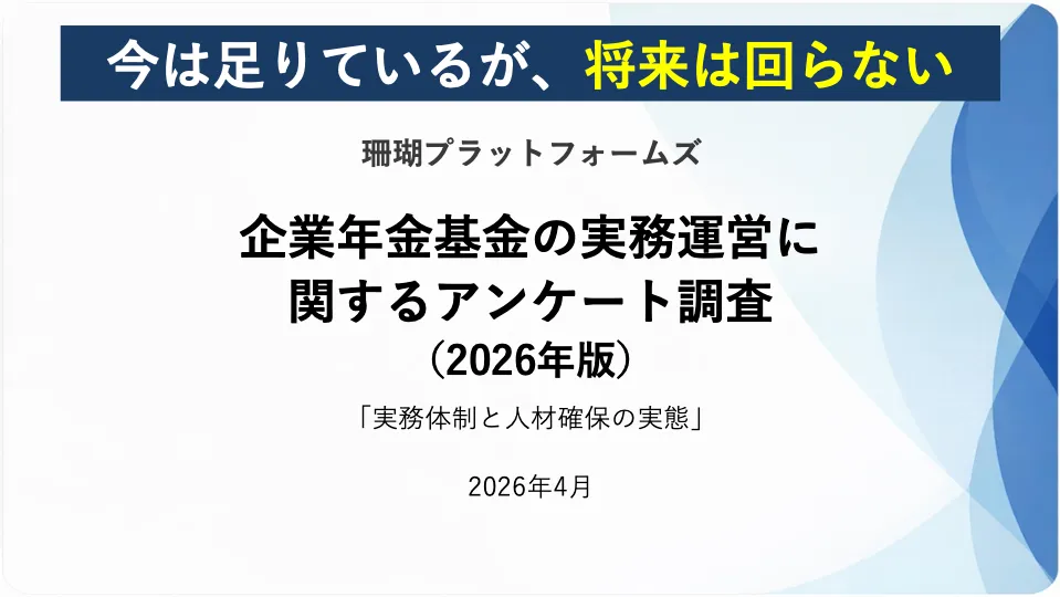 最近、株式会社珊瑚プラットフォームズが実施した「企業年金基金の実務運営に関するアンケート調査(2026年版)」の結果が公開され、企業年金基金における人材問題の実態が浮かび上がってきました。本調査により、企業年金基金はその運営を非常に少人数で支えており、将来にわたる人材確保が深刻な課題であることがわかりました。