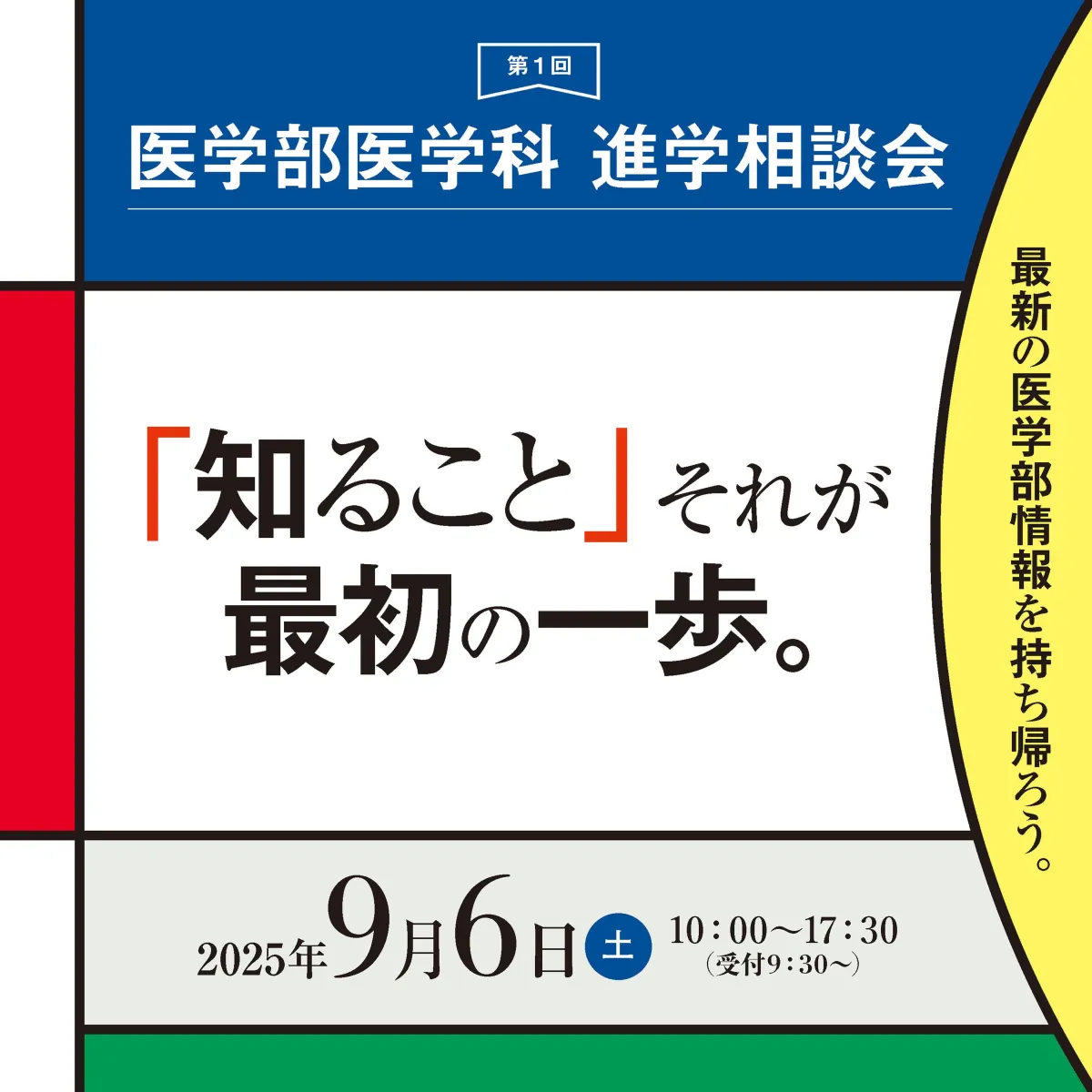 「第1回 医学部医学科進学相談会」は、さまざまな大学の医学部情報を得る貴重な機会です。ここでしか得られない情報を手に入れて、医師への道を切り拓きましょう。入場は無料ですが、人気のプログラムは事前予約をお勧めします。皆様のご参加をお待ちしております。
