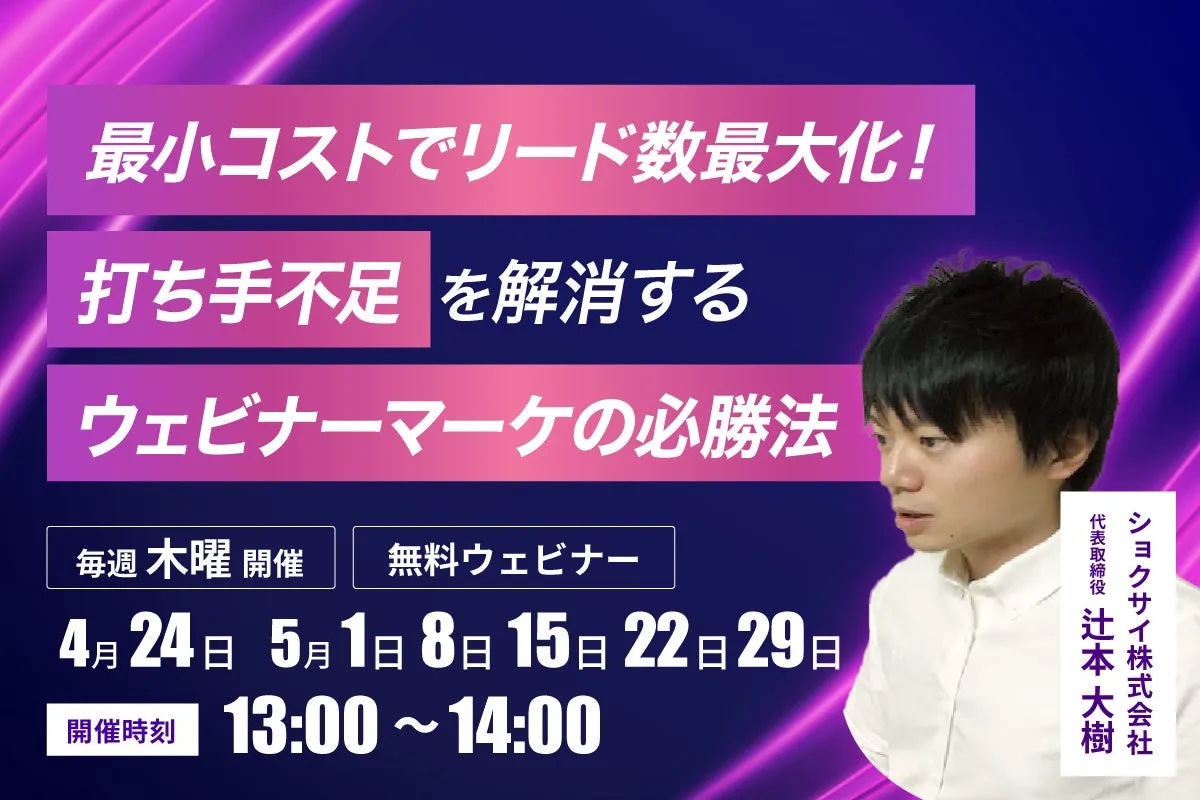 企業の成長を支えるために、効果的なリード獲得は欠かせません。そこで、ショクサイ株式会社では、BtoBマーケティング担当者向けに「最小コストでリード数最大化!打ち手不足を解消するウェビナーマーケの必勝法」という無料ウェビナーを開催します。このセミナーでは、リード獲得のためのウェビナー運営のテクニックを詰め込んだ内容をご用意しています。