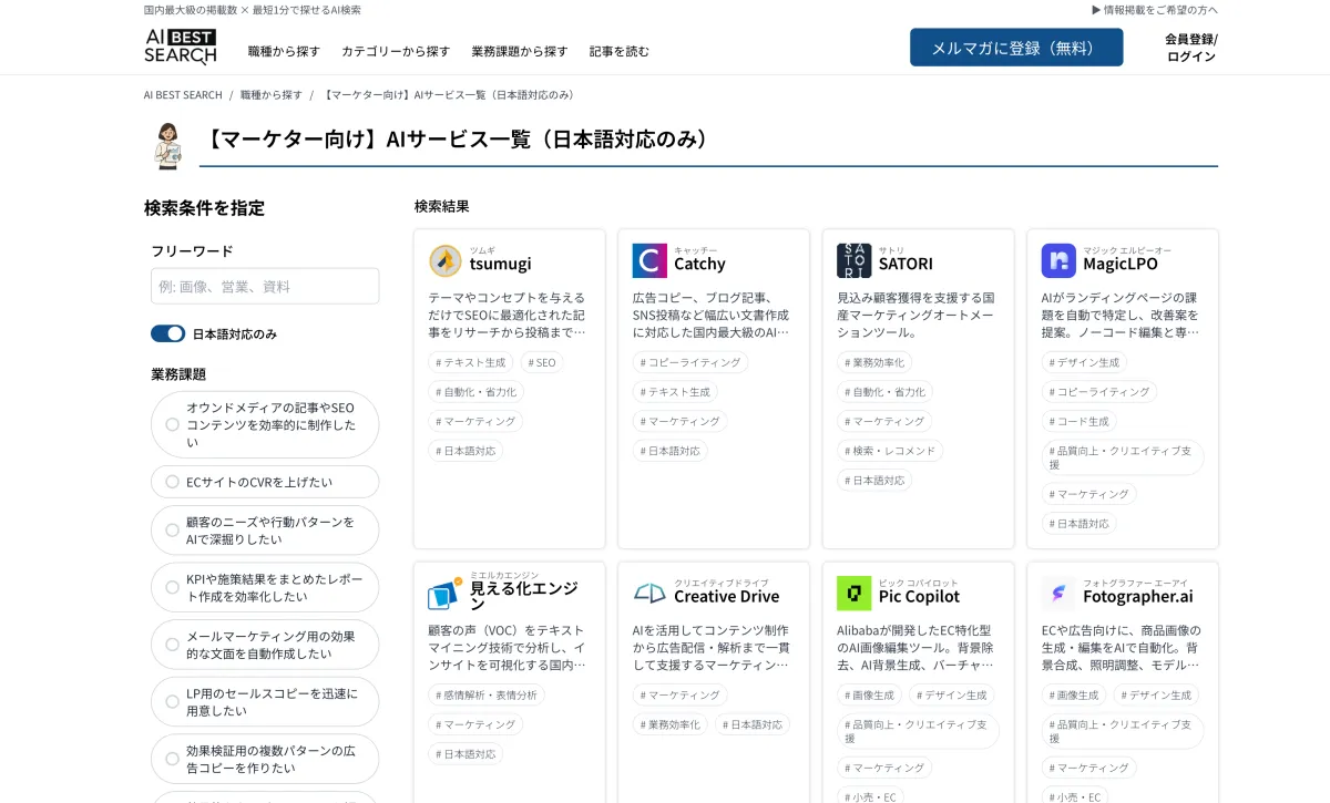 訪問者に対して役立つ情報を提供するため、SEO対策にも力を入れています。記事の内容は業種別に分かれた特集が充実しており、AIツールに関する知識を深めることができるのが特徴です。例えば、「2025年版 マーケターの課題を解決するAIツール13選」といった形で、具体的な業務に役立つ情報が満載です。