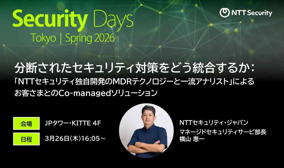 NTTセキュリティ・ジャパンは、2026年3月26日(木)の講演で、「分断されたセキュリティ対策をどう統合するか」というテーマで、NTT独自開発のMDRテクノロジーを用いたソリューションについて説明します。サイバーリスクの高度化が進むなか、多くの企業がリアルタイムで全体最適な対策を講じることが難しくなっている現状において、この講演は特に価値があるでしょう。