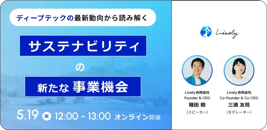 Lively合同会社が2026年5月19日(火)に開催するウェビナー「ディープテックの最新動向から読み解くサステナビリティの新たな事業機会」をご紹介します。このウェビナーは、サステナビリティ分野におけるディープテックの活用方法や今後のビジネスチャンスについての洞察を提供します。ウェビナーは、オンラインでの配信で、参加者は自由に入退室が可能です。参加費は無料です。