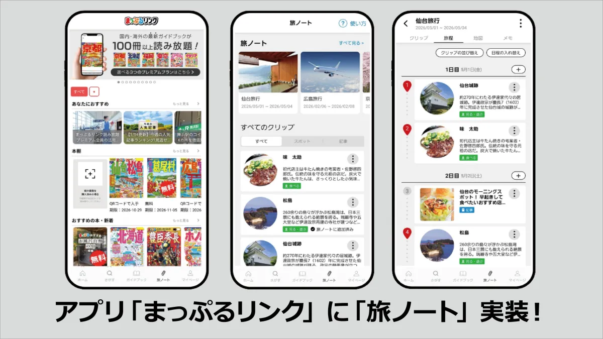 「まっぷるリンク」では、サブスクリプションサービス「ガイドブック読み放題」も提供中で、こちらのサービスと合わせて利用すれば、より充実した計画が可能に。全国のガイドブックから気になる情報を得て、瞬時に「旅ノート」にクリップすることで、情報収集とプランニングを効率よく進めることができます。