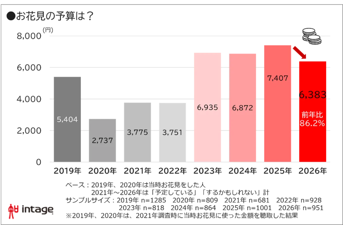 2026年、日本における花見市場は前年と比較して2割減少し、総計2,341億円となりました。このデータは株式会社インテージが日本全国の15歳から79歳の男女2,500人を対象に実施した調査によるものです。調査結果をもとにした今年の花見の動向を詳しく見ていきます。