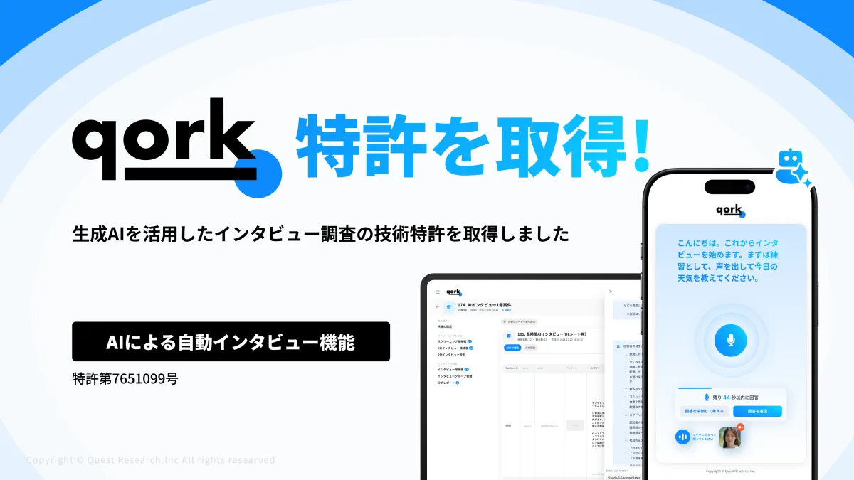 株式会社Quest Researchは、クラウドベースのインタビューサービス「qork」に関する特許を取得しました。この特許は、生成AIを活用して質の高い候補者選定を可能にするもので、特に定性調査のプロセスにおける業務効率と精度の向上が期待されています。