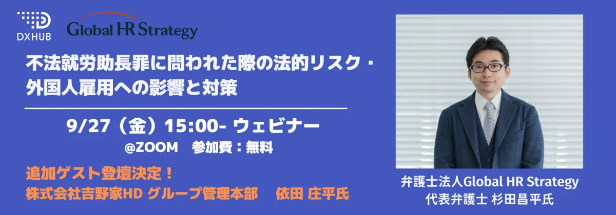 DXHUB株式会社が主催するウェビナーが、2024年9月27日(金)に開催されます。本ウェビナーでは、外国人労働者を雇用する企業向けに、最新の法務動向やリスク回避策を専門家から学ぶ貴重な機会です。