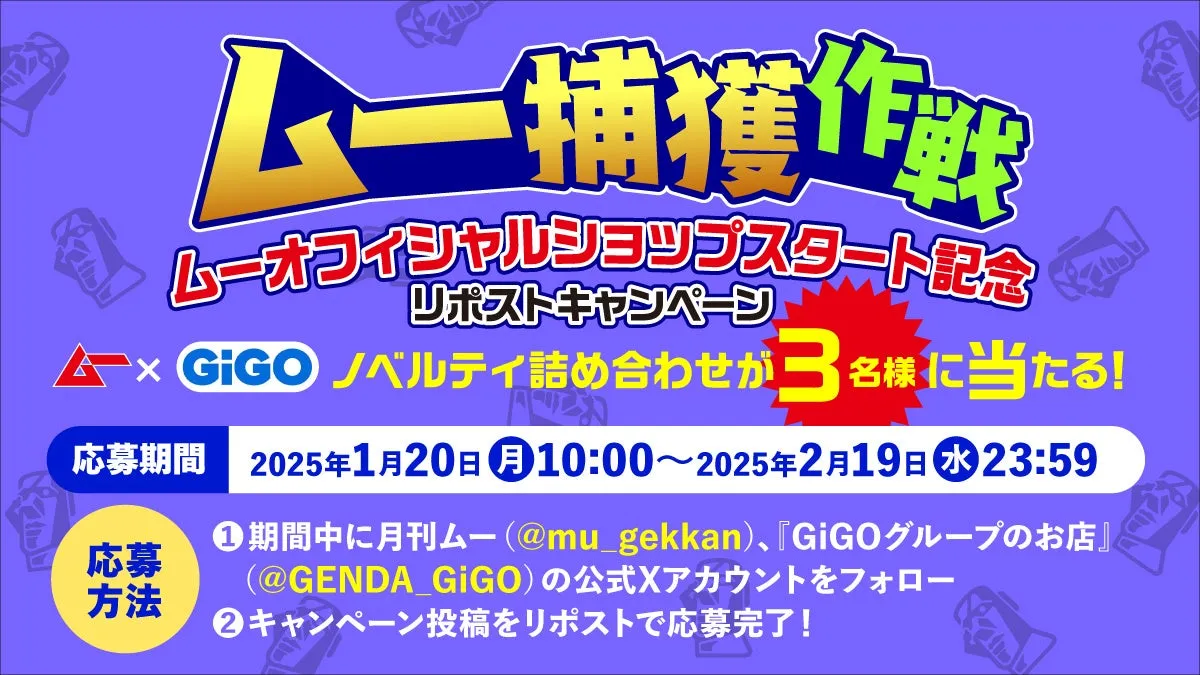 「ムー捕獲作戦」開催に合わせ、月刊ムー公式X(@mu_gekkan)およびGiGOグループ(@GENDA_GiGO)のアカウントをフォローし、キャンペーン投稿をリポストした方の中から抽選で3名様に「ムーオリジナルTシャツ」(Lサイズ)とGiGOノベルティのセットが贈られます。