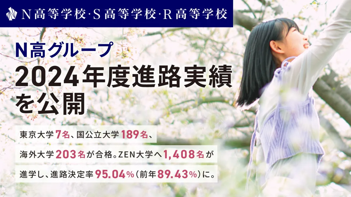 学校法人 角川ドワンゴ学園N高等学校・S高等学校・R高等学校(以下、N高グループ)は、この度2024年度の進路実績を公式サイトで公開し、その圧倒的な伸びが教育界に新たな旋風を巻き起こしています。2024年度、N高グループは過去最高の進路決定率95.04%を達成し、前年の89.43%から大幅な向上を遂げました。卒業時点での進路未決定者の割合も、前年の10.37%から4.84%へと激減し、生徒一人ひとりの将来への道筋がより明確になったことを示しています。