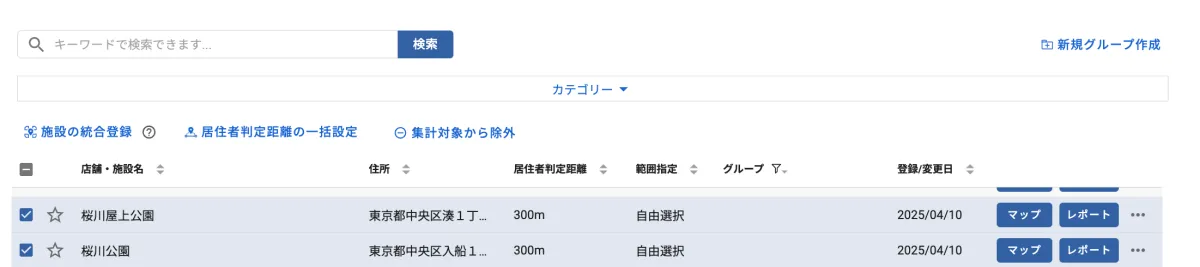 新機能では、ユーザーが管理画面を通じて複数の施設を選択し、簡単に統合登録することができます。具体的には、選択した施設のエリアが地図上に表示され、その上で統合名を入力するだけで登録が完了。複数の施設を持つ商業施設や公園など、空間が分断されていても、来訪者数を一元的に把握できるようになります。これにより、マーケティング施策がより効果的に行えるように。