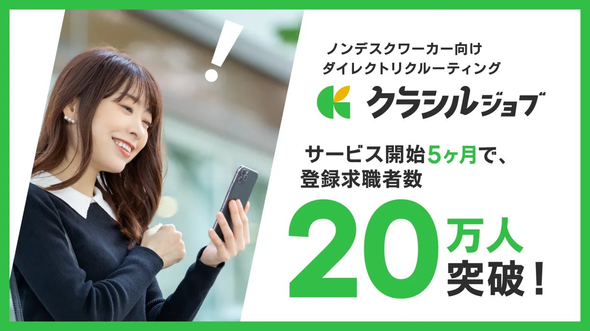 dely株式会社が提供するHRサービス「クラシルジョブ」は、ノンデスクワーカー専用のダイレクトリクルーティングサービスとして急成長を遂げています。2024年9月のサービス開始からわずか5ヶ月で登録求職者数が20万人を超えたことが発表されました。この成長の背景には「クラシルリワード」との連携があり、高い求職者集客力がポイントです。