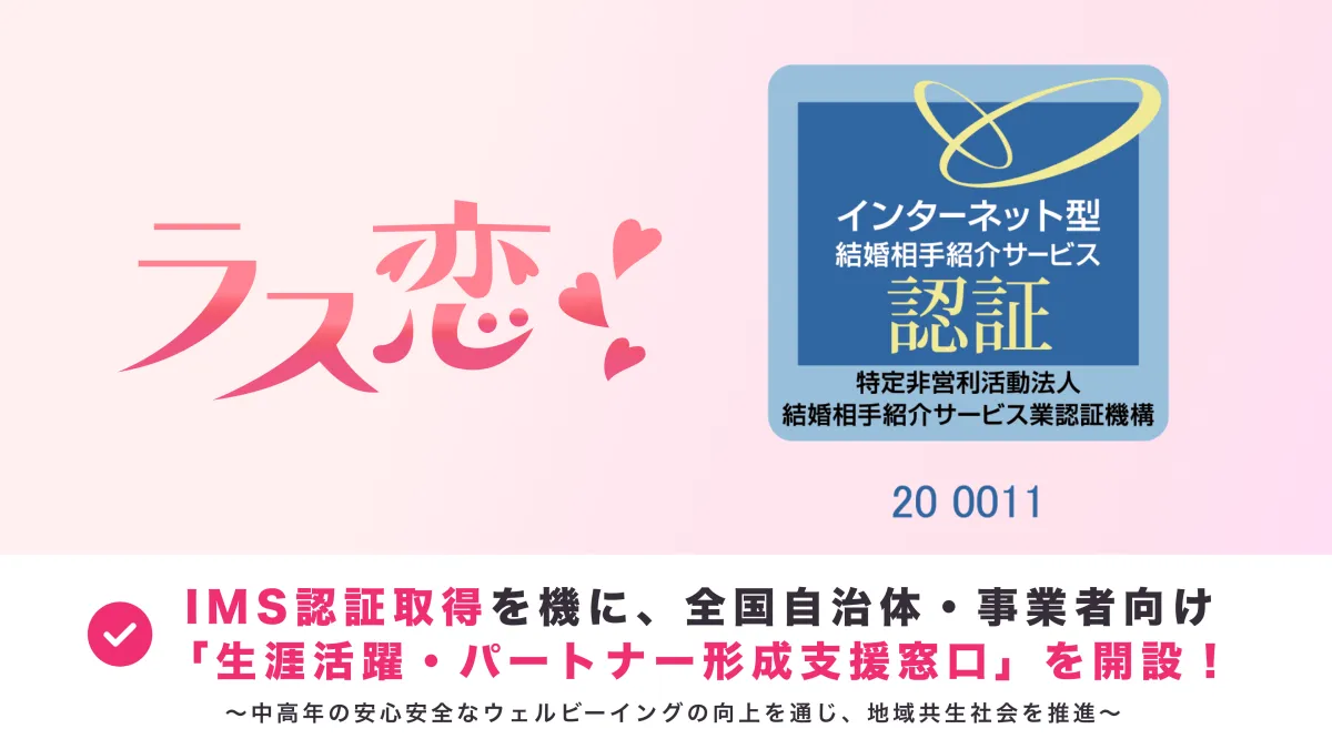 このIMS認証の取得を機に、ラス恋は全国の自治体や事業者と協力し、中高年の交流や再パートナーの形成を支援するための「生涯活躍・パートナー形成支援窓口」を設立することを発表しました。これにより、中高年層の再出発をバックアップし、豊かな地域社会の構築を目指します。