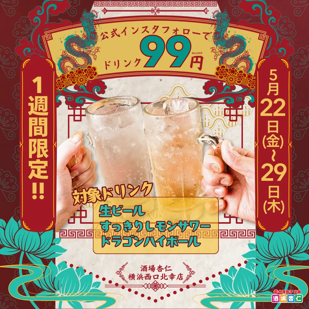 特に注目すべきは、2025年5月23日から29日の期間中に実施される、Instagramフォロワー向けの特別キャンペーンです。この期間中、公式Instagramをフォローした来店者は、生ビール、すっきりレモンサワー、ドラゴンハイボールの人気3種ドリンクを何杯でも1杯99円(税込109円)で楽しむことができます。これにより、仲間たちと一緒に飲み会を楽しむ絶好のチャンス!